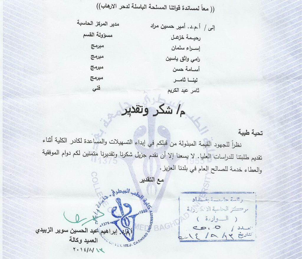 شكر خاص للسيد مدير المركز ولمنتسبي قسم البرمجةCc26/08/2014كلية الطب البيطري في جامعة بغداد تقدم شكرها ... المزيد